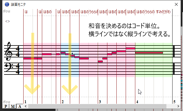 つまり横並びになっているメロディをまるごと上下に移動させる「横ライン」考えではなくて、コードの切り替わる箇所を区切りとした「縦ライン」で考えて作っていくのです。