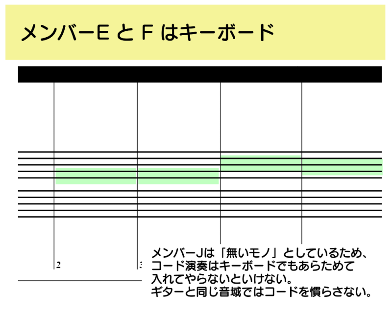 メインのキーボード演奏にはメンバー E と F を使っています。コード演奏を入れる場合は、ギターのコード演奏音域とは重ならないようにします。