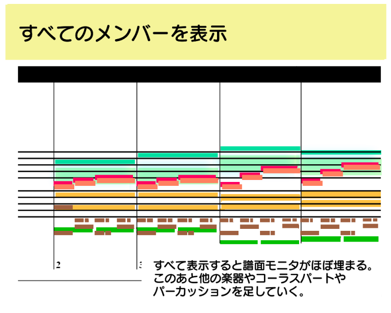 「それぞれのメンバーがどのオクターブを担当するか」が大体決まっているので、ここまでで譜面モニタはほぼ隙間なく埋まりますw