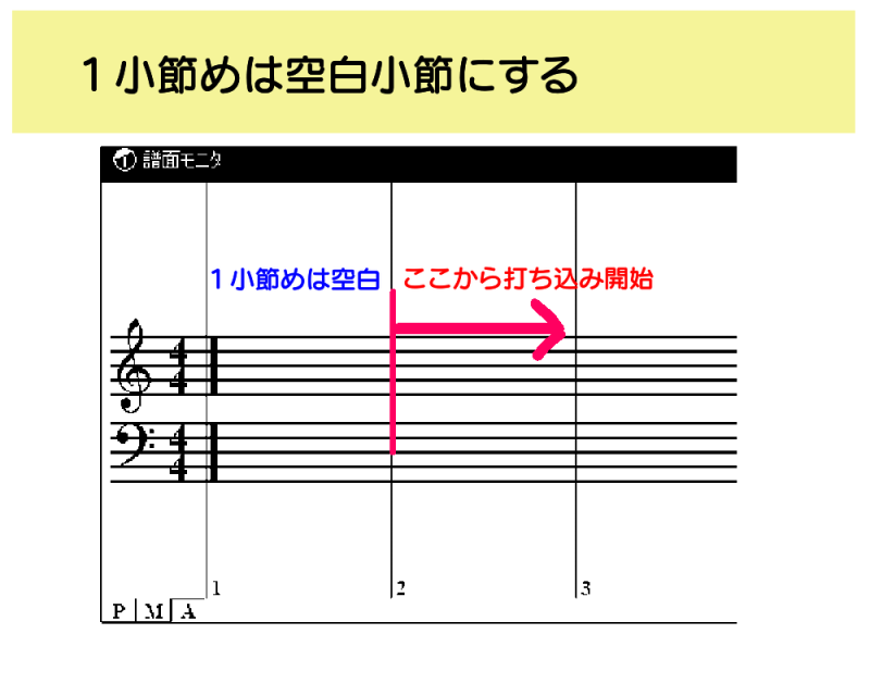 まずは最初の1小節を空けます。冒頭には音色などの設定がたくさんあります。Museにそれらを読みこむ時間を与えたいので。