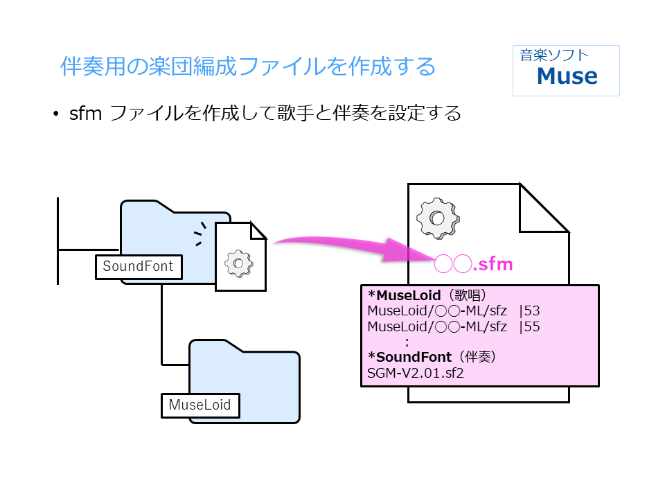 テキストエディタで MuseLoid歌手ごとに sfmファイル(楽団編成ファイル)を作成します。出来上がった sfmファイルは SoundFontフォルダへ放り込みます。